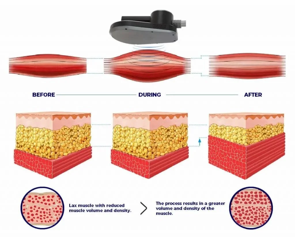 MSculpt is an Electro Muscle Stimulation and Contouring Machine with HIFEM (High-Intensity Focused Electromagnetic) which works by inducing supramaximal muscle contractions not achievable by voluntary action. When applied, the muscles respond with a deep remodeling of its inner structure, inducing muscle hypertrophy and creation of new protein strands and muscle fibers which will be noticed as an increased muscle density and volume.